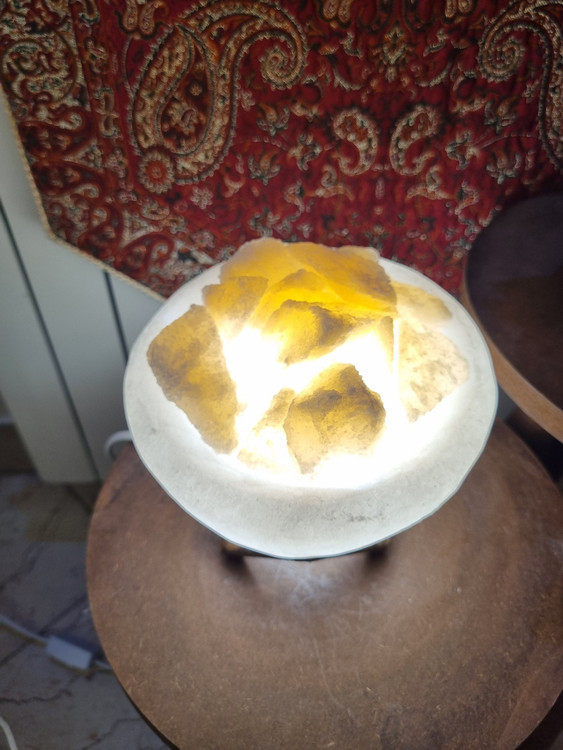 کاسه سنگ نمک آباژوری با تکههای سنگ نمک و پایه و لامپ
