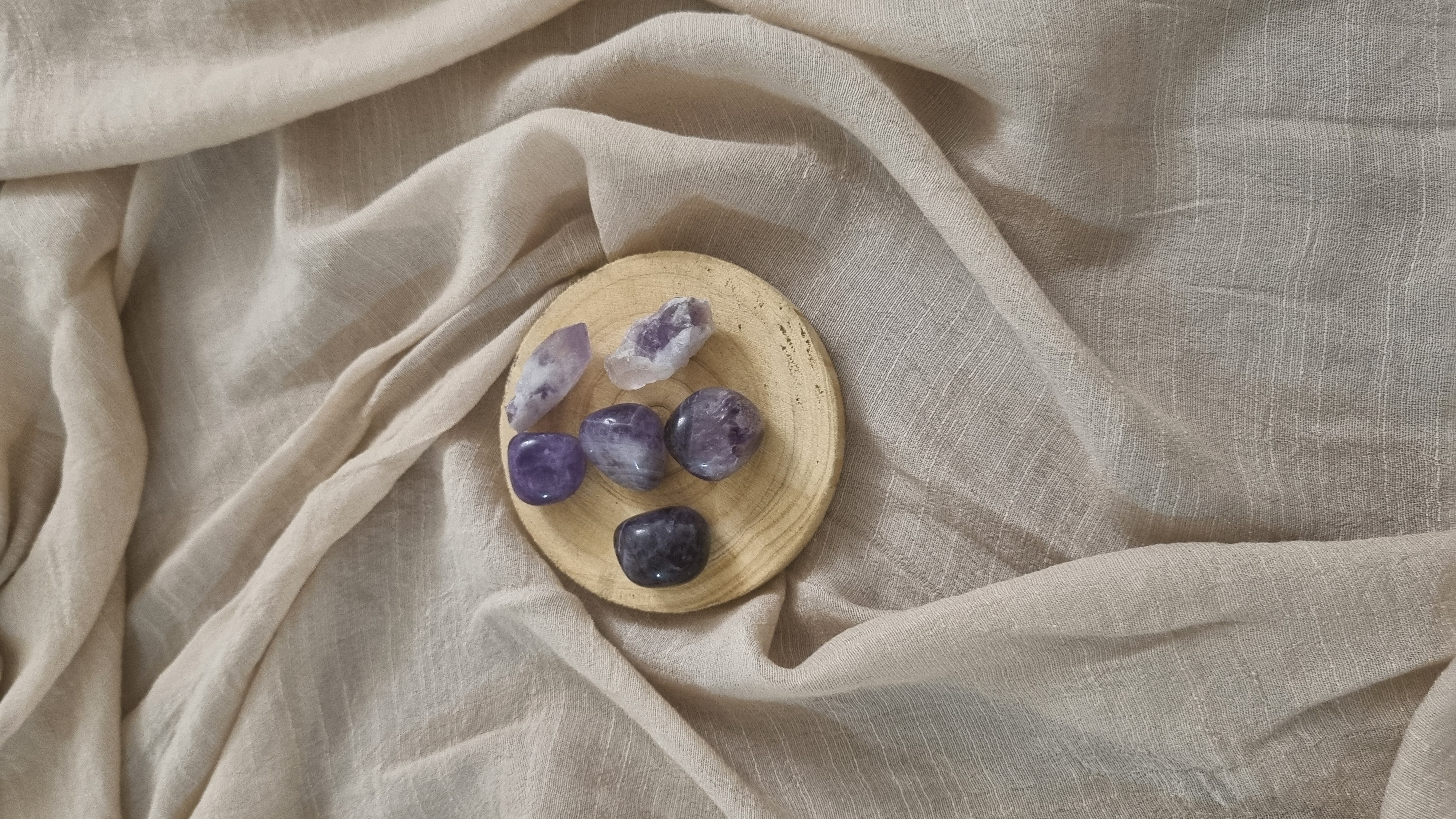سنگ آمیتیست طبیعی، نماد آرامش، تعادل ذهنی و ارتقاء آگاهی. مناسب برای مدیتیشن، خواب راحت، پاکسازی انرژی منفی و فعالسازی چاکرای چشم سوم.